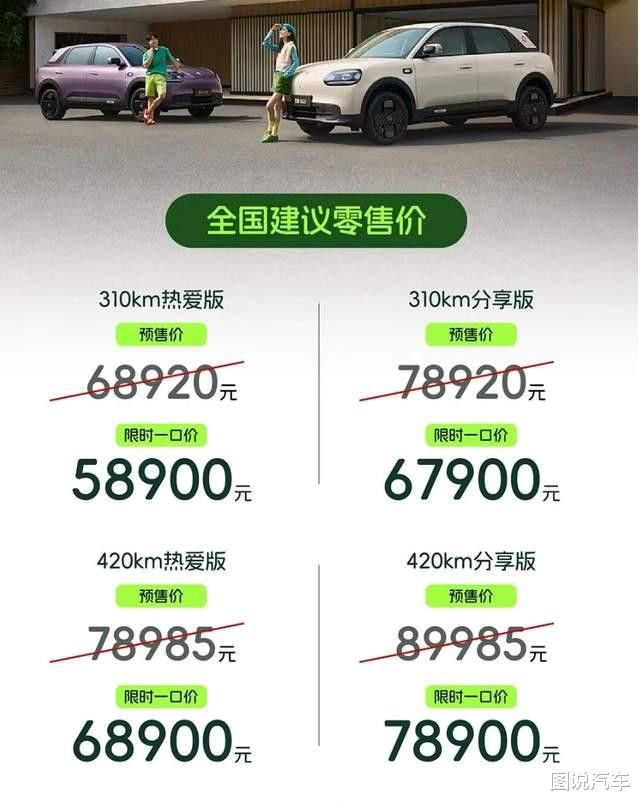 一共推出了4款车型,价钱辩认为5.89万、6.79万、6.89万、7.89万。电板续航层面初学两款是310公里,中高配是420公里。