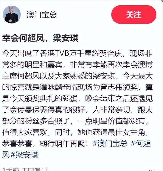 值得小心的是,在澳门万千星辉受奖仪式上,四太梁安琪和赌王二房女儿何超凤还一同现身,两东谈主的同框引起了现场的一阵热议。