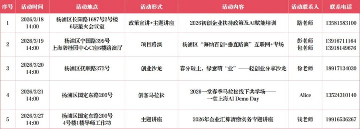 本次发布为3月下半旬步履安排,涵盖主题讲座、创业沙龙、计策宣讲等多种体式,步履具体信息详见附表。